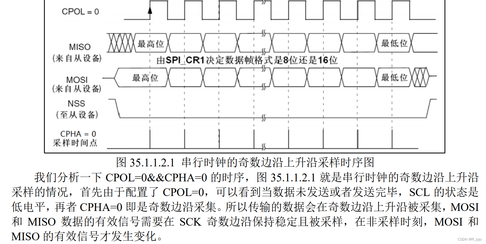 CPHA 实质指的是数据的采样时刻,CPHA= 0 的情况就表示数据的采样是从第 1 个边沿信 号上即奇数边沿,具体是上升沿还是下降沿的问题,是由 CPOL 决定的。这里就存在一个问题: 当开始传输第一个 bit 的时候,第 1 个时钟边沿就采集该数据了,那数据是什么时候输出来的 呢?那么就有两种情况:一是 CS 使能的边沿,二是上一帧数据的最后一个时钟沿。