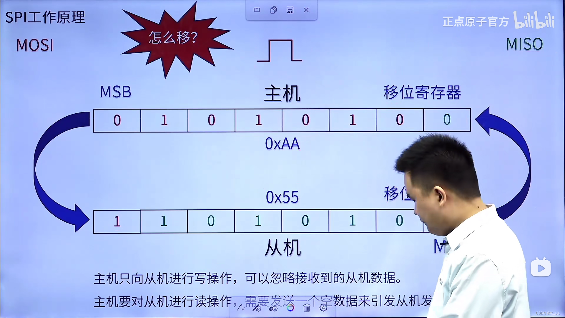 SPI 的工作原理:在主机和从机都有一个串行移位寄存器,主机通过向它的 SPI 串行寄存 器写入一个字节来发起一次传输。串行移位寄存器通过 MOSI 信号线将字节传送给从机,从机 也将自己的串行移位寄存器中的内容通过 MISO 信号线返回给主机。这样,两个移位寄存器中 的内容就被交换。外设的写操作和读操作是同步完成的。如果只是进行写操作,主机只需忽略 接收到的字节。反之,若主机要读取从机的一个字节,就必须发送一个空字节引发从机传输。