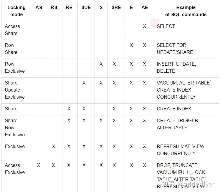 | ExclusiveLock(7) | 和AccessExClusiveLock类似,但和最低级别的读锁AccessShareLock兼容 |