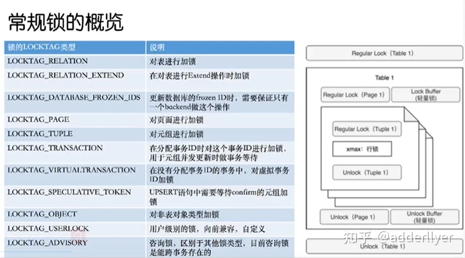 常规锁(Regular lock):对数据库对象加锁,PostgreSQL两阶段锁就是借助常规锁实现的。根据封锁对象的不同,他有分成了不同粒度,如对表、页面、元祖、事务ID等分别加锁。已最常见的表锁为例,当不同的事务操作一个表时,会尝试通过表的Oid来构造LockTag,这样每个数据库对象都会有一个唯一标识,然后根据这个唯一的标识到锁表中申请锁。postgreSQL数据库将常规锁分层了8个不同的等级,不同的操作需要使用不同等级的常规锁。