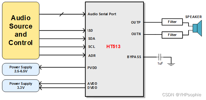 HT513内部集成了DA转换器,其I2S输入支持32-bit字节,并且可自动监测采样频率,支持192kHz。