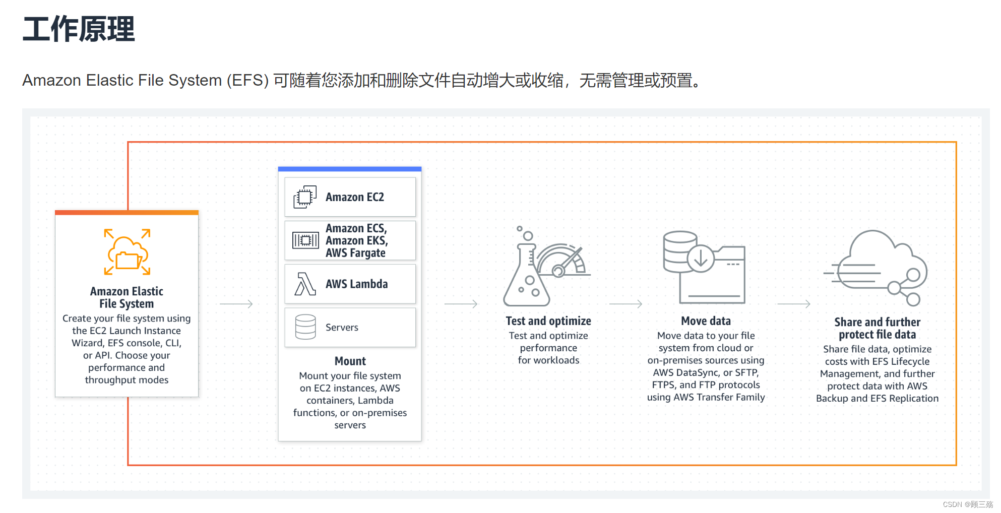 - 弹性和可扩展性:EFS 提供无限的存储容量,可以根据需要自动扩展,以满足应用程序的需求。它适用于大量的文件共享和存储场景。