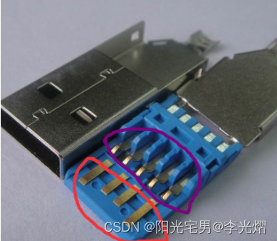 如下图USB3.0内部有9根线,而USB2.0是黑色,且只有4根线。
