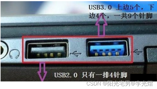 对于USB的B型接口,USB2.0由于只有4根线,且内部是黑色的,而USB3.0是蓝色标识的。