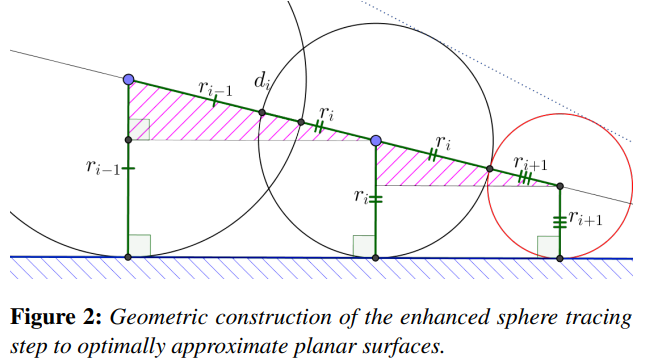 Accelerating Sphere Tracing 在 enhanced 的基础上更进一步。假设前两次 marching 所形成的 sphere 都相切于同一平面,那么下一次可以尝试 marching 同样与该平面相切并且也与上一次的 marching sphere 相切的距离。同样,如果尝试失败则回退至保守 marching。