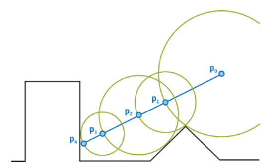 " role="presentation"> 开始投射一条 ray,以 SDF 值p 0 f ( p 0 ) " role="presentation"> 为步长进行一次 marching。 - 以上次 marching 的终点为起点,以