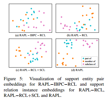 对于“−IBPC−RCL+SCL”,在“−IBPC−RCL”模型中加入了一个有监督的对比学习目标(Khosla et al., 2020; Gunel et al., 2021),其中把那些共享相同关系的实体对作为正样本,否则作为负样本。