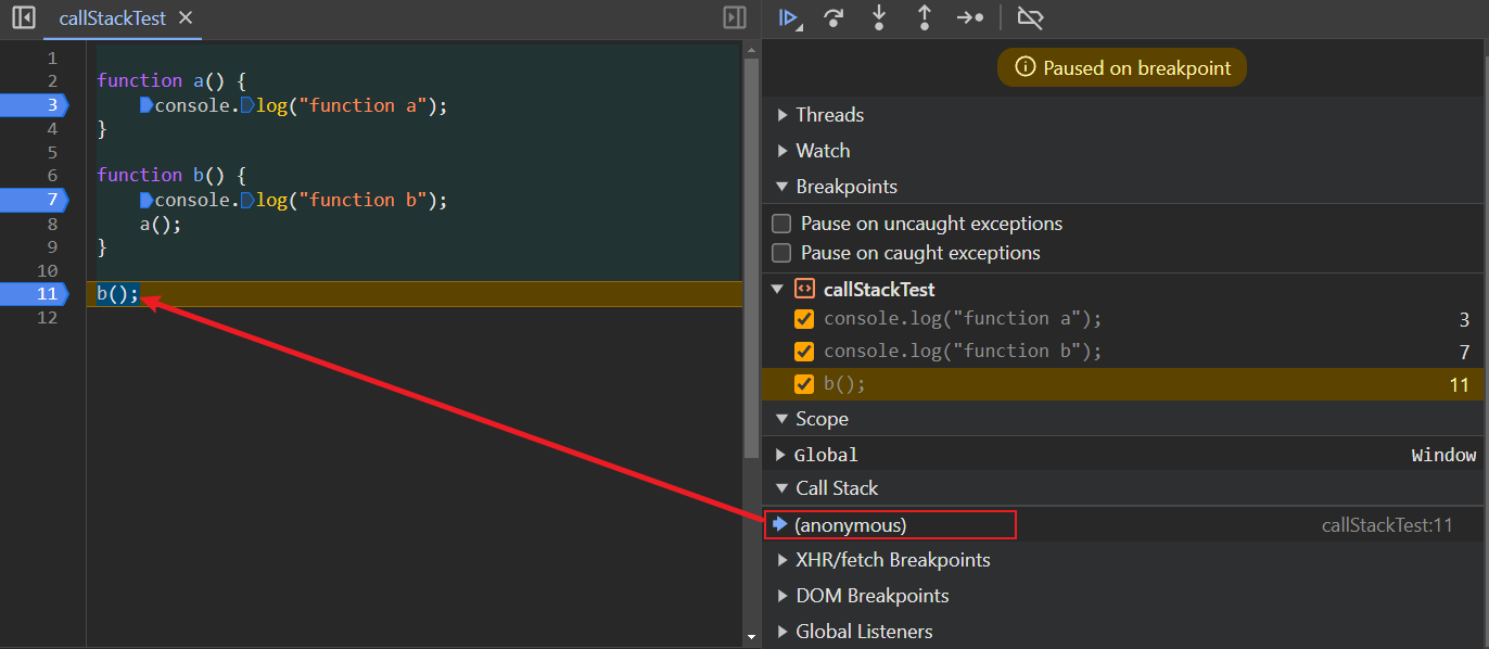 第一步:在执行b()前会创建一个全局执行上下文,就是下图中的(anonymous)