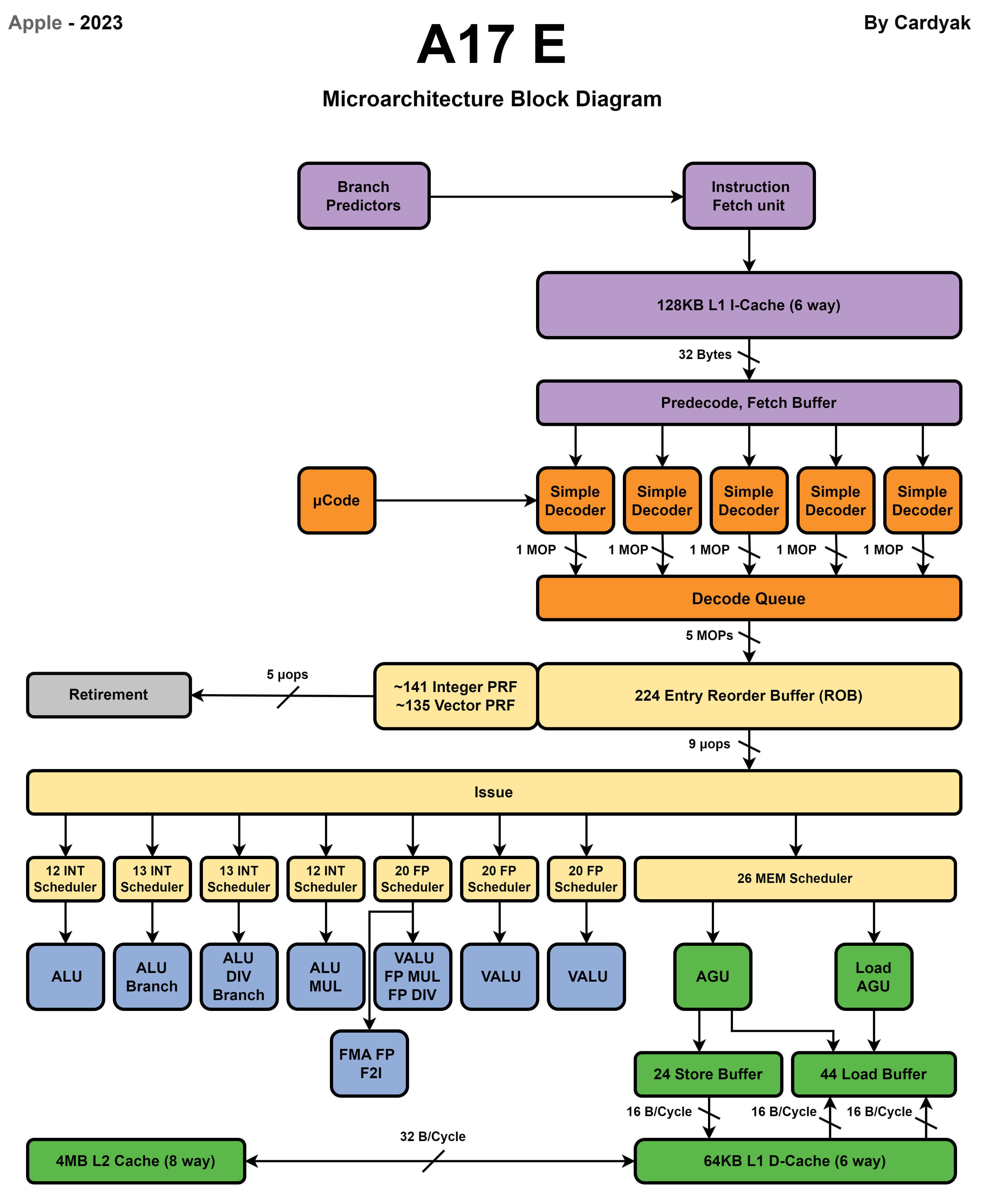 | A17 E | Apple 能效核 | ARMv8 | 1 | 5 | 224 | 5 | 5 | 128 KB(D) + 64 KB(I) | 4 MB(共享) | NEON | 3.05 |