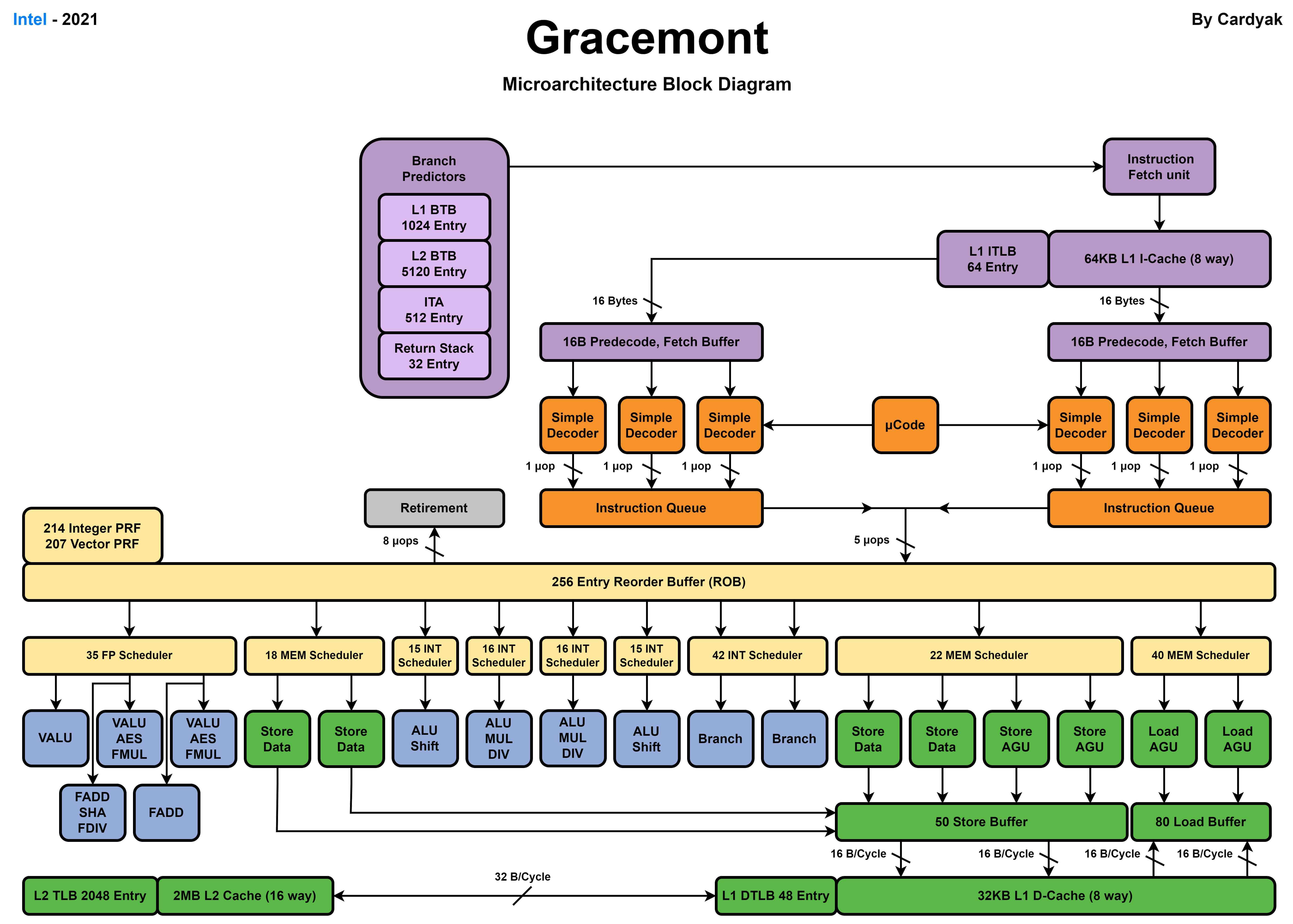 | Gracemont | Intel 能效核 | x86-64 | 1 | 6 | 256 | 6 | 8 | 32 KB(D)、64 KB(I) | 2 MB(共享) | AVX 256 | 2.52 |