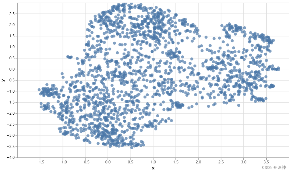 接下来我们根据该数据集的emb字段来绘制散点图,图中的每一个点表示wiki_articles的一个text,不过首先我们需要定义一个绘图函数umap_plot_big,在函数中我们调用umap的降维算法将原先的4096个维度降到两个维度,这样我们才能在二维平面中画出散点图: