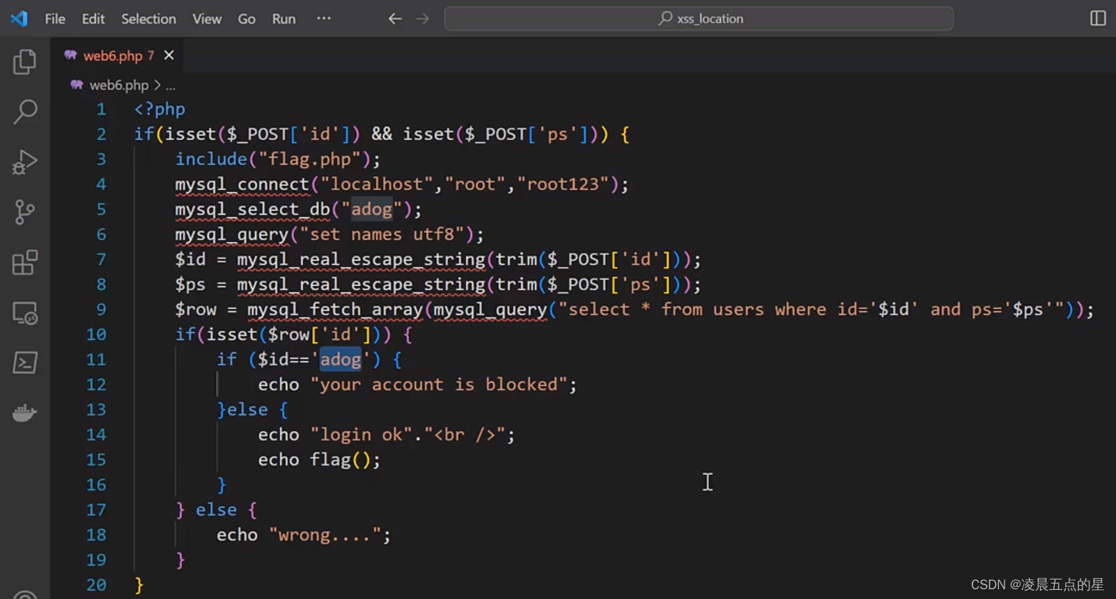 首先它会接两个参数一个是id一个是ps,传递的话会包含一个flag.php,然后数据库连接,之后传递过滤,然后查询,如果查到了就会取id,取出来看是不是跟adog一样,如果是它告诉你账号被锁定,如果不是展示flag