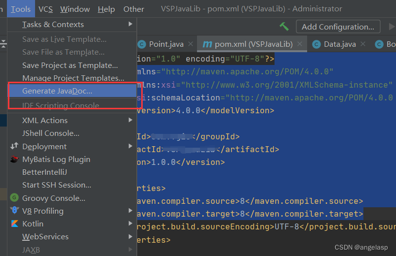 1. (选中要生成文档的类或者源码包)找到工具栏tools --> Gencrate JavaDoc...打开, 如下图: