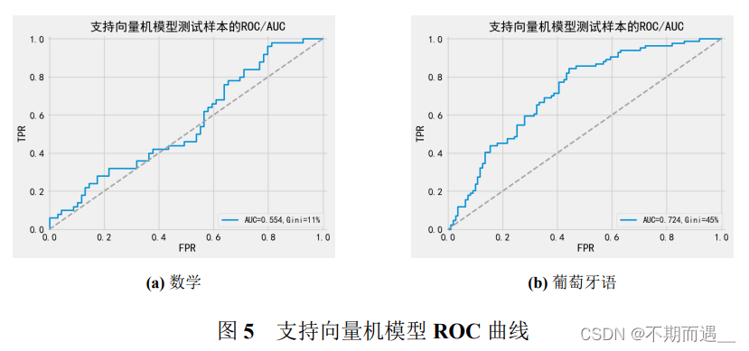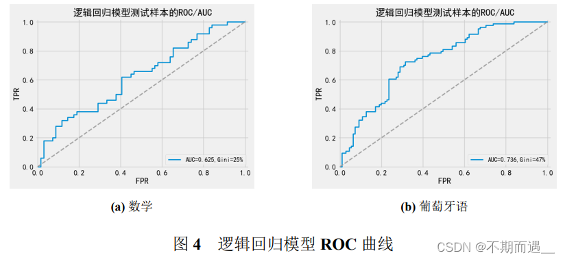 从模型的评估中我们可以得到两个模型的精确率(precision)、召回率(recall)、F1-score,可以看出梯度提升分类树在数学数据集上预测的准确率为60%,而逻辑回归在葡萄牙语数据集上预测的准确率为70%。