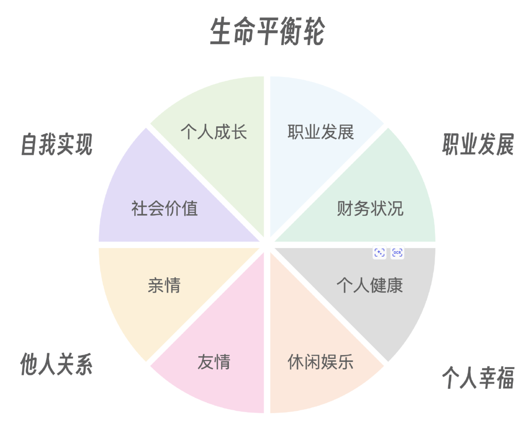 在一个生命平衡论里,职业发展只占了 1/8,你看,我们的人生不只有职业发展,还有亲情、友情,还有休闲娱乐,还有最最重要的个人健康,还有我们渴望的自我实现。