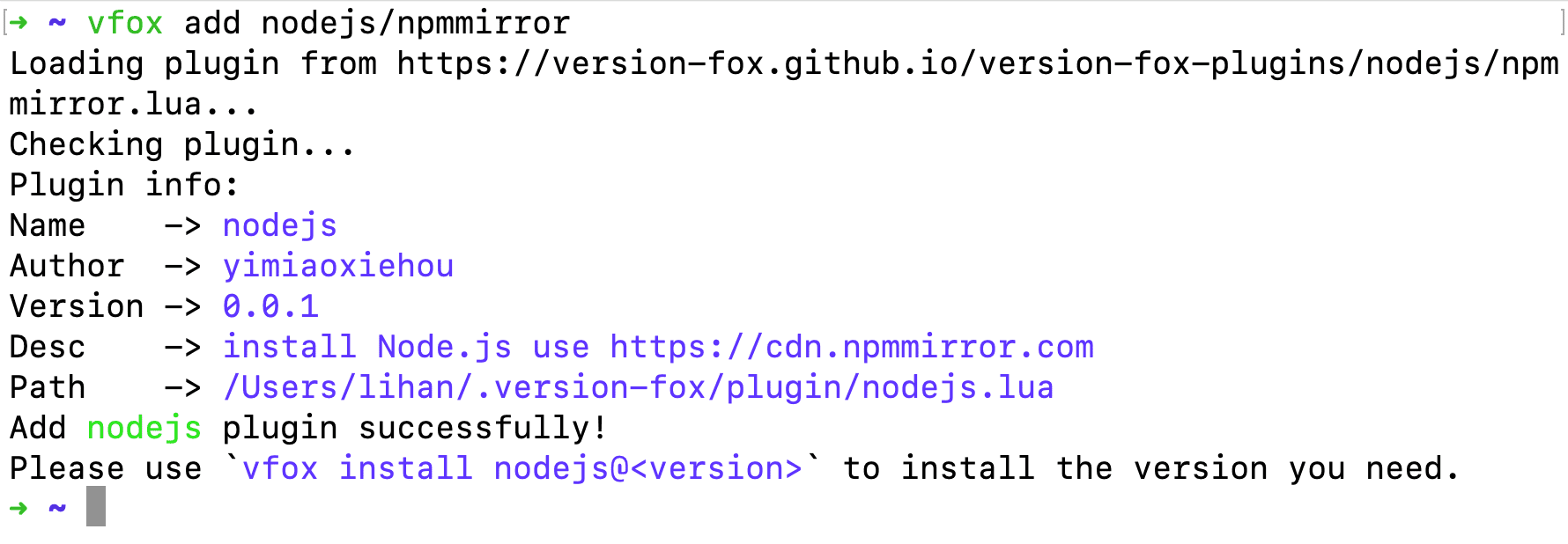 所以你还需要安装插件,以 Node.js 为例,为了获得更好的体验,我们添加 npmmirror 镜像源插件:vfox add nodejs/npmmirror。