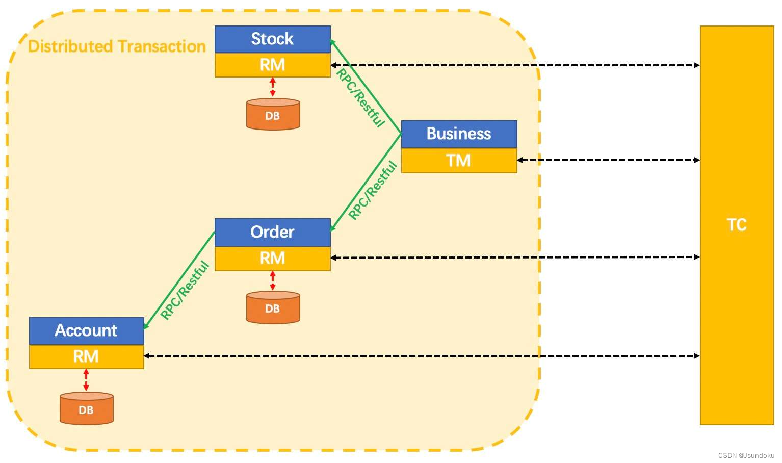 Saga 模式是 Seata 提供的长事务解决方案,在 Saga 模式中,业务流程中每个参与者都提交本地事务,当出现某一个参与者失败则补偿前面已经成功的参与者,一阶段正向服务和二阶段补偿服务都由业务开发实现。