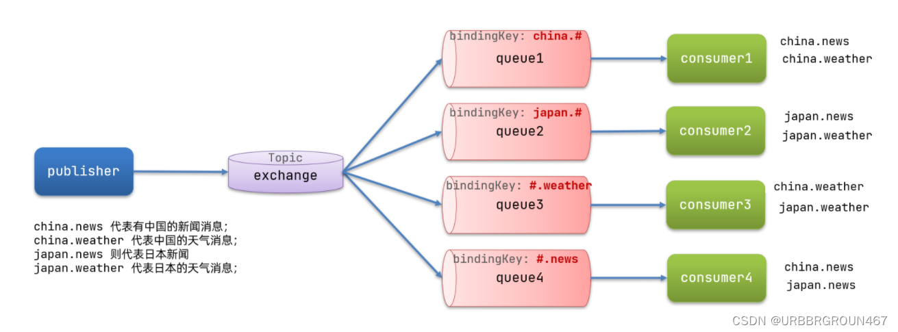 china.# ,因此凡是以 china.开头的routing key 都会被匹配到。包括china.news和china.weather#.news ,因此凡是以 .news结尾的 routing key 都会被匹配。包括china.news和japan.news案例需求: