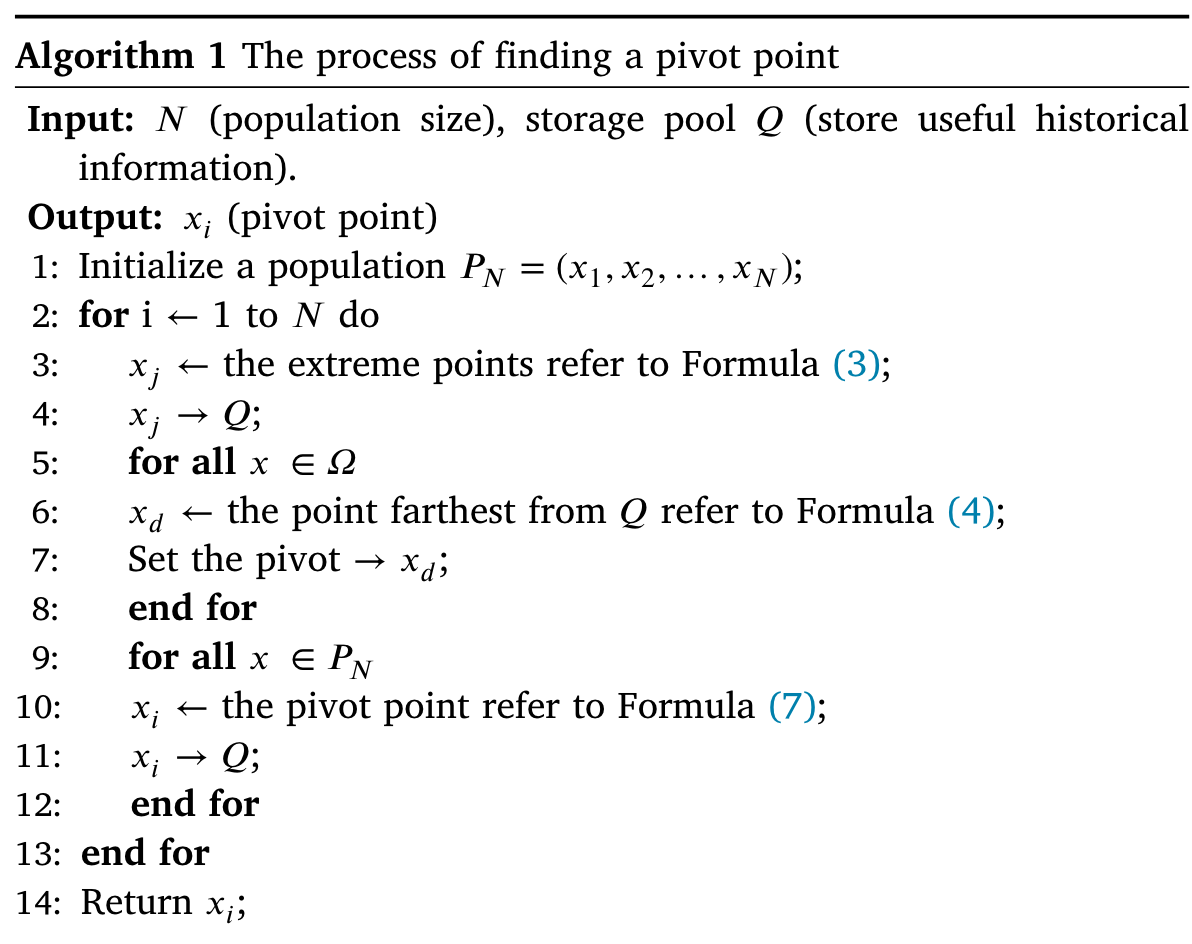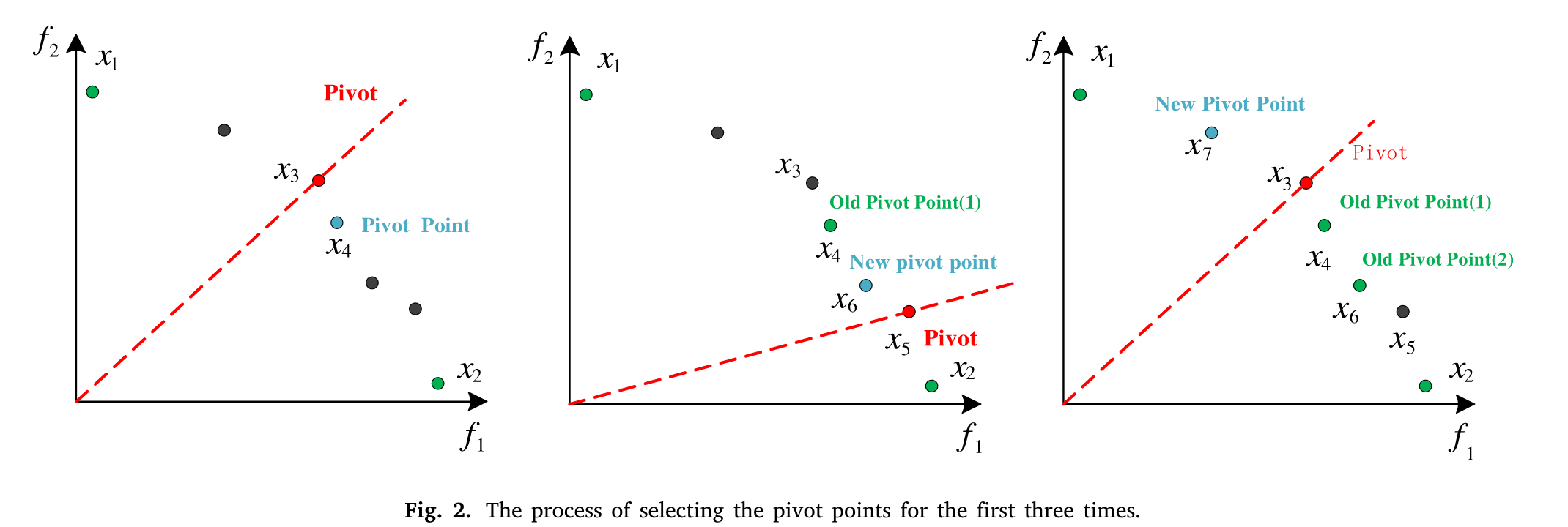 首先初始化一个大小为N的种群,并建立一个存储池Q用于存储历史信息.然后在目标空间中通过动态选择机制迭代地选择枢轴点,并将枢轴点放入存储池Q中。下图展示了在一开始的三个时刻选择枢轴点的过程: