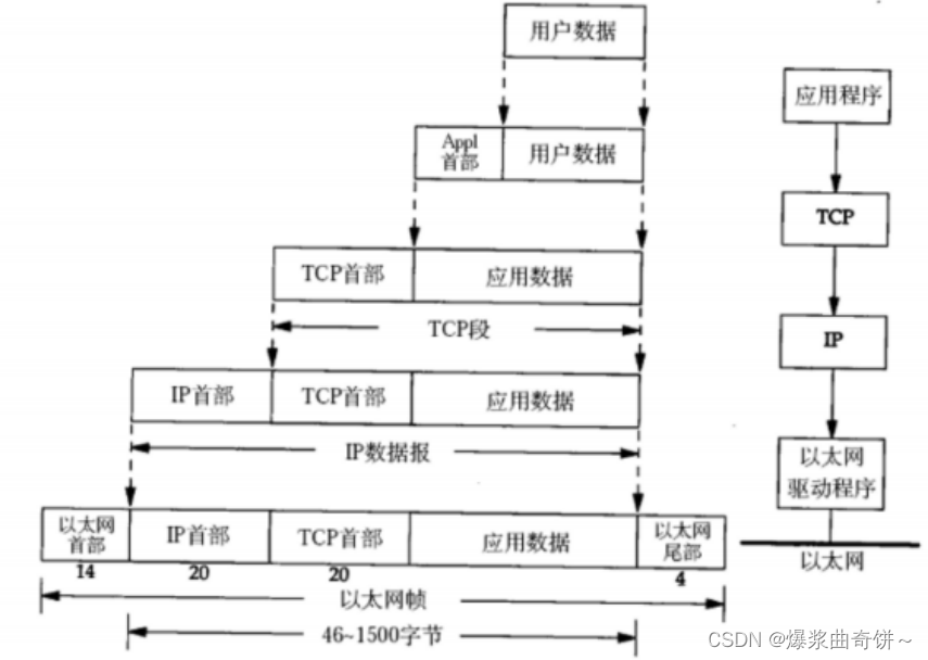 - 应用层数据通过协议栈发到网络上时,每层协议都要加上一个数据首部(header),称为封装 (Encapsulation)。