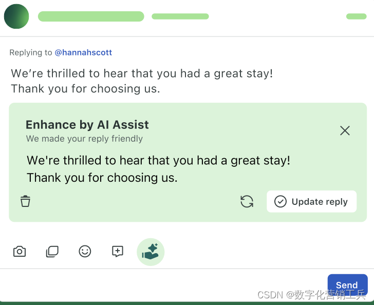 尽量减少手动方法,并花费更多时间与客户联系。通过AI Assist增强建议使用其他回复来增强语气或构建更精细的回复。