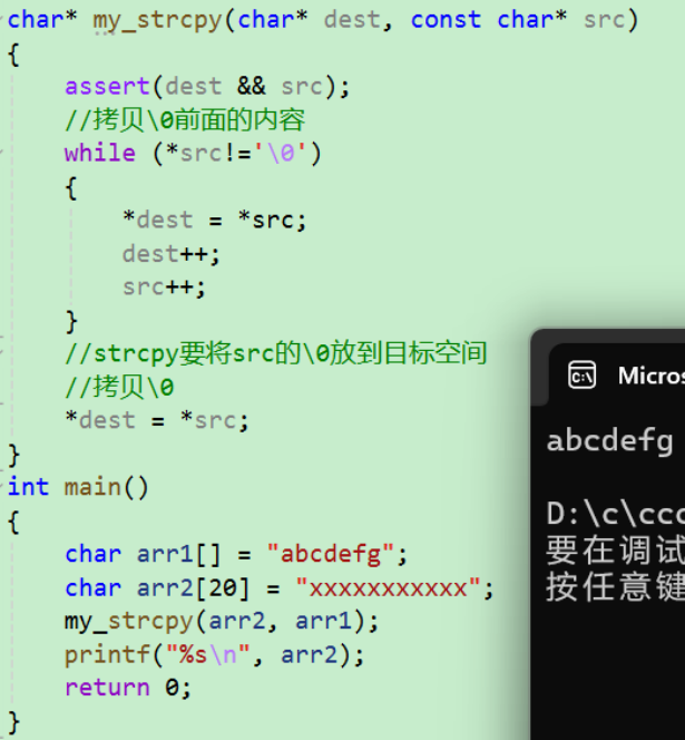 看到调试的结果 我们就知道strcpy会将源字符串的’\0’拷贝到目标文件