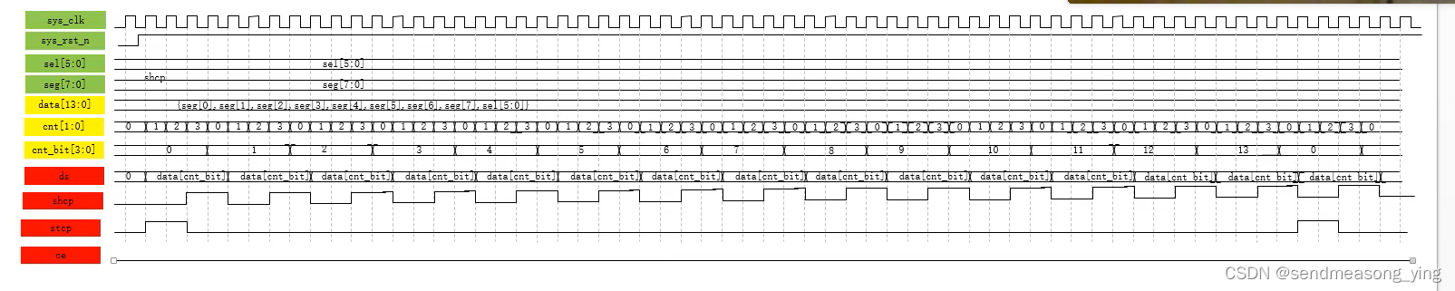 因为q0是最高位,共阳极数码管结构是dp....a,所以应该先传入低位a,而a在上图中的8段2进制编码中是seg[7],所以段选信号的顺序是seg[0],...seg[7]。