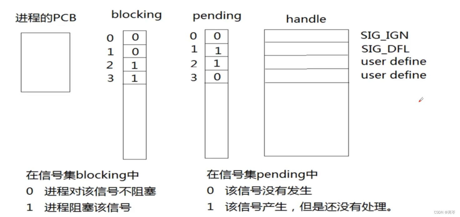 __sigset_t set;:定义了一个变量set,类型为__sigset_t,这是一个用于表示信号集的数据结构。sigemptyset(&set);:使用sigemptyset()函数将信号集set清空,确保其中不包含任何信号。sigaddset(&set,2);、sigaddset(&set,3);和sigaddset(&set,9);:使用sigaddset()函数向信号集set中添加信号。在这里,将信号2、3和9添加到set中,分别代表SIGINT、SIGQUIT和SIGKILL信号。int sm=sigprocmask(SIG_SETMASK,&set,NULL);:使用sigprocmask()函数将set中的信号设置为进程的信号掩码集。SIG_SETMASK表示设置当前信号掩码为set中包含的信号集合,即阻塞信号2、3和9。如果设置成功,sigprocmask()返回0;否则返回-1,并且相应的错误信息会被设置到errno中。while(1){}:进入一个无限循环,使得程序一直处于运行状态,以保持信号掩码的设置。