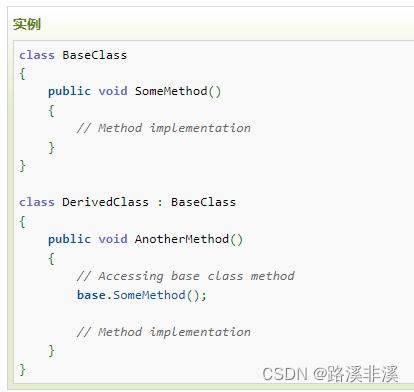 派生类会继承基类的成员(字段、方法、属性等),除非它们被明确地标记为私有(private)。派生类可以通过关键字base来调用基类的构造函数和方法。