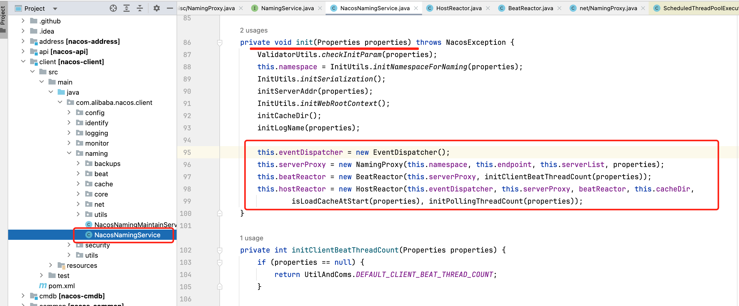 根据以上线程的名称和原理流程图,我们可以在nacos源码里找到对应的位置,代码如下: