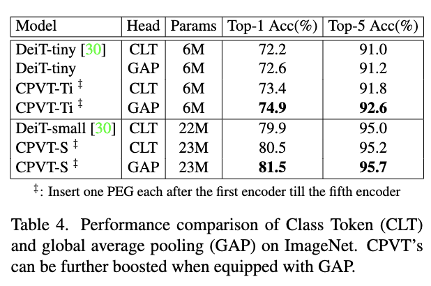 - 此外,论文还提供了class token的替代方案,使用平移不变的全局平均池(GAP)进行类别预测。通过GAP,CPVT可以实现完全的平移不变性,性能也因此进一步提高约1%。相比之下,基于绝对位置编码的模型只能从GAP中获得很小的性能提升,因为其编码方式本身已经打破了平移不变性。