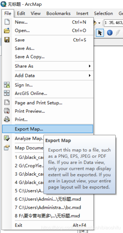 完成后,我们切换到“Layout View”这一视图,调整好范围和大小,用如下方法导出地图即可。因为是副图,暂时不需要调整地图要素、地图边框等内容。