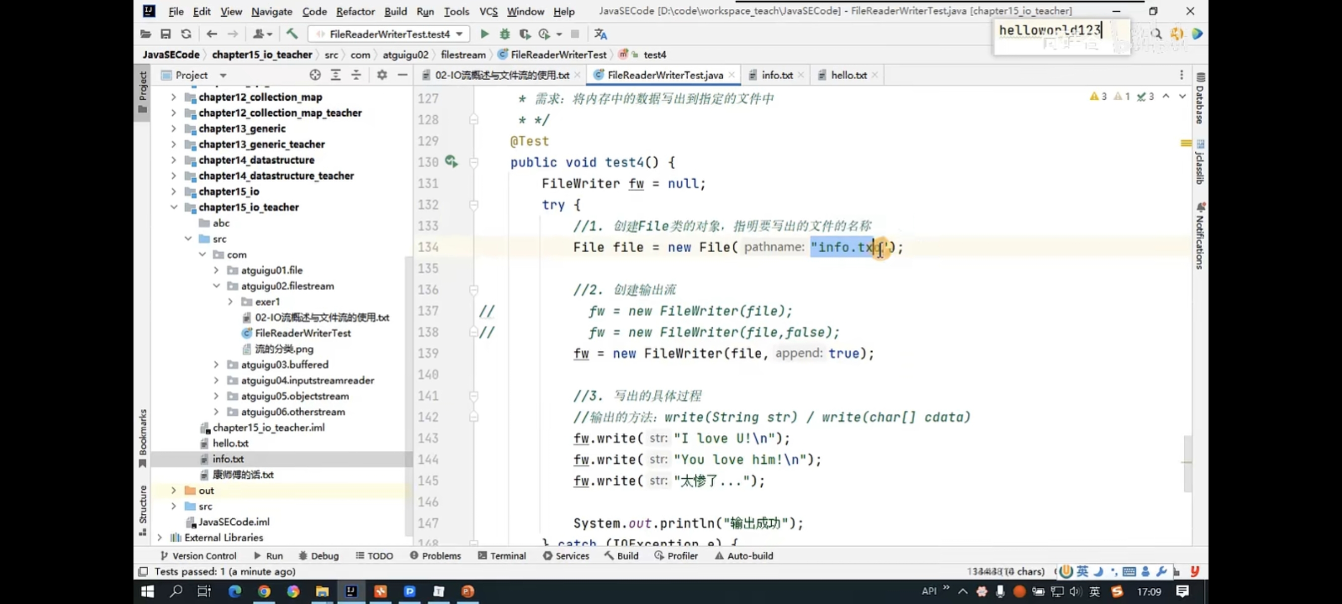 - 如果此文件存在,使用FileWriter(File file,true):输出数据过程中,会在现有的文件的末尾追加写出内容