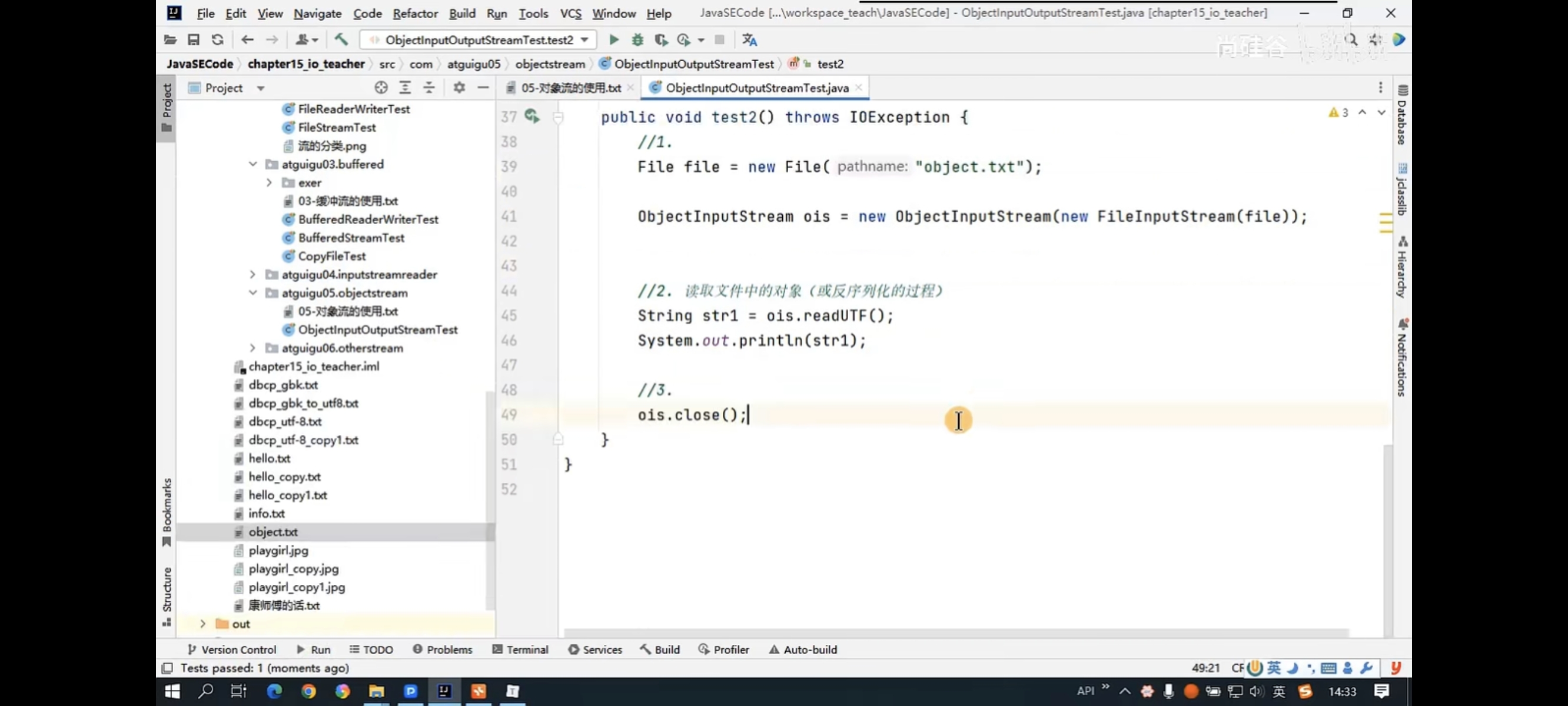 - 反序列化过程:使用ObjectInputStream流实现。将文件中的或网络传输过来的数据还原为内存中的Java对象。
