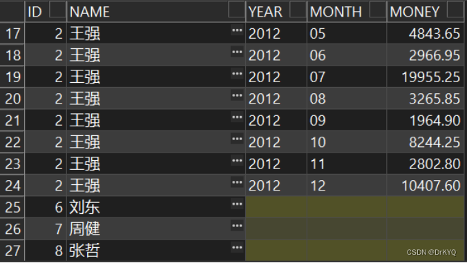 需求 :查询业主的账务记录 ,显示业主编号、名称、年、月、金额。