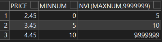 | select price, minnum, nvl2(maxnum, to_char(maxnum), '不 限') from t_pricetable where ownertypeid=1 |