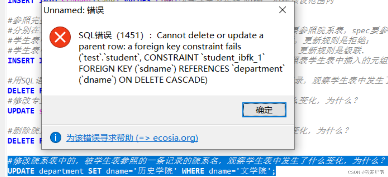 - #学生表中的所在院系sdname参照department表的dname,删除规则是级联,更新规则是拒绝;