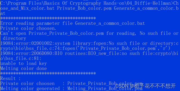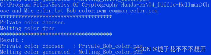 4Bob将自己的私钥(参数1)与公共随机值(参数2)混合,输出混合后的结果:Melting_Bob_color.pem: