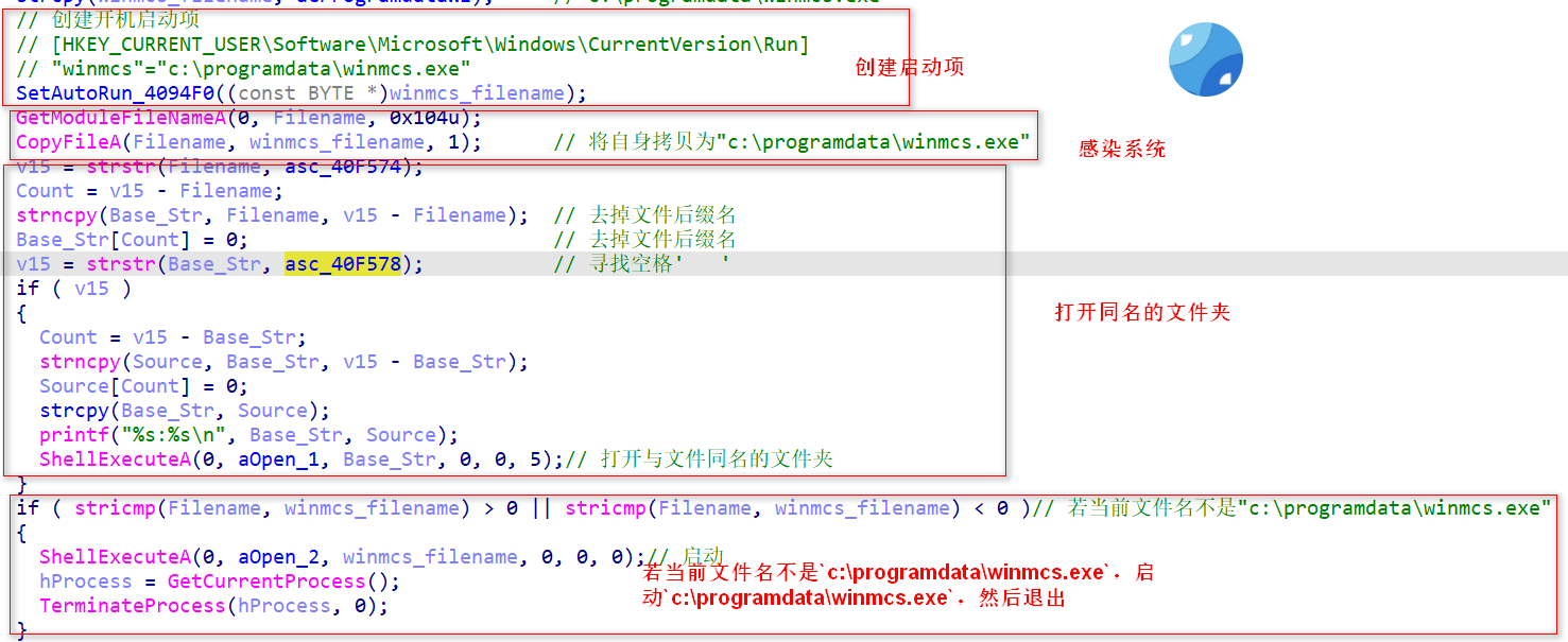 若当前文件名不是c:\programdata\winmcs.exe,启动c:\programdata\winmcs.exe,然后退出。