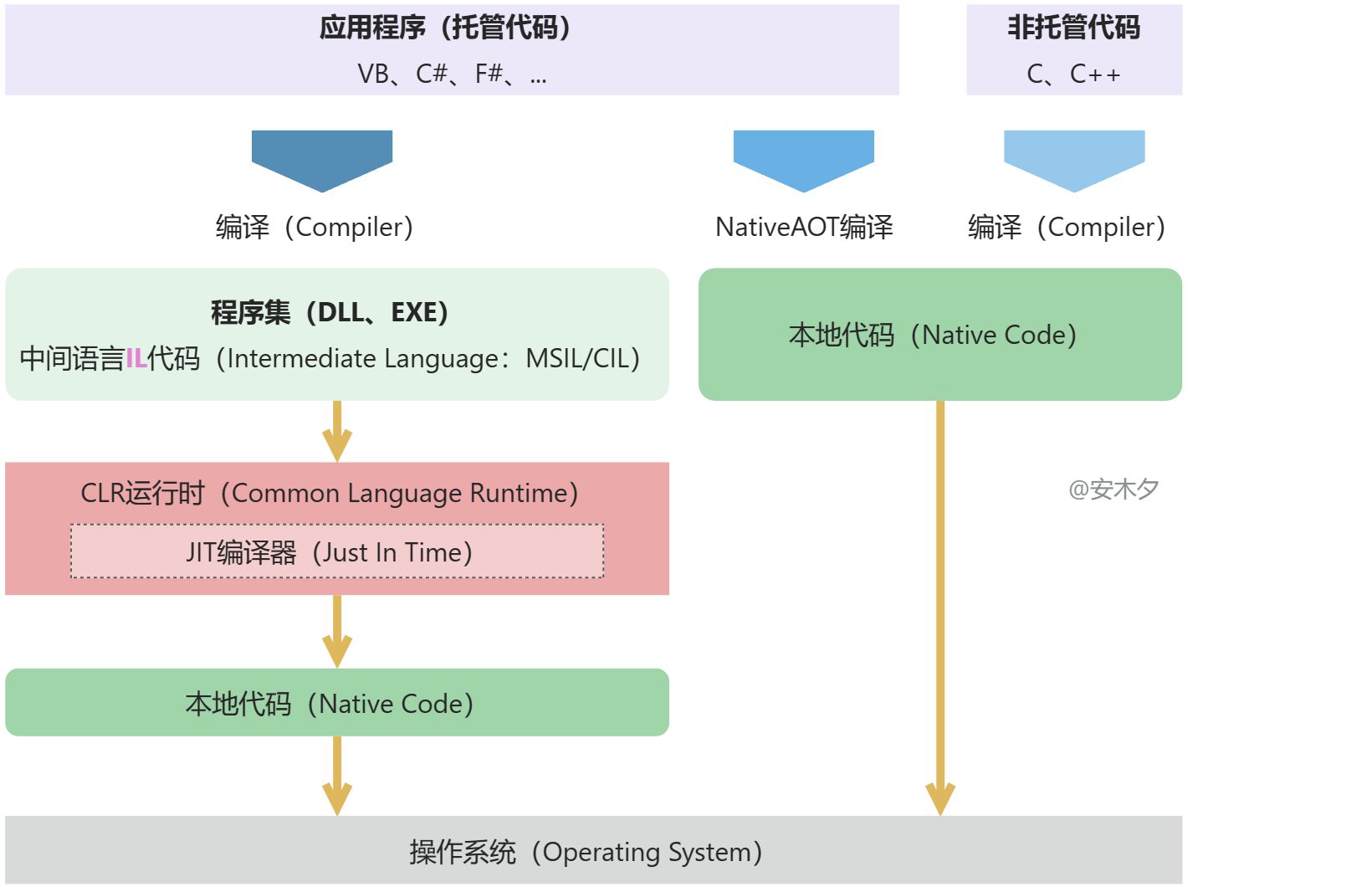 - 运行阶段:CLR把中间语言CIL代码编译为平台专用的机器代码,最终在CPU上运行的就是机器码(汇编代码)。