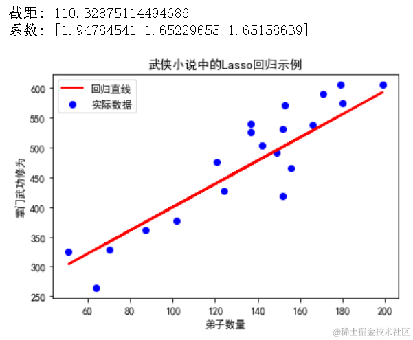 假设我们有一组数据,记录了某武侠小说中不同门派的弟子数量、门派成立时间、武器种类数量以及掌门的武功修为。我们可以使用Lasso回归来预测这些因素对掌门武功修为的影响。
