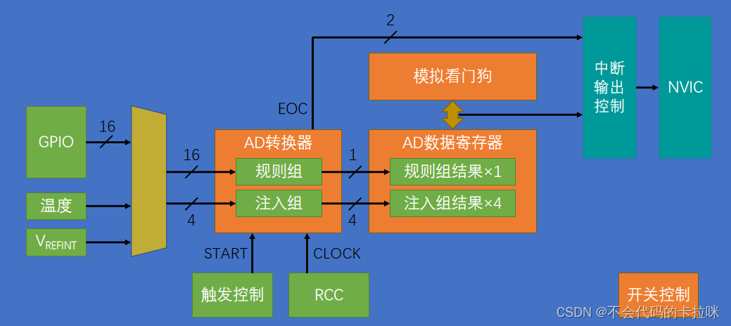 - ADC_ITConfig(ADC_x, ADC_IT_EOC, ENABLE); //配置成规则通道中断