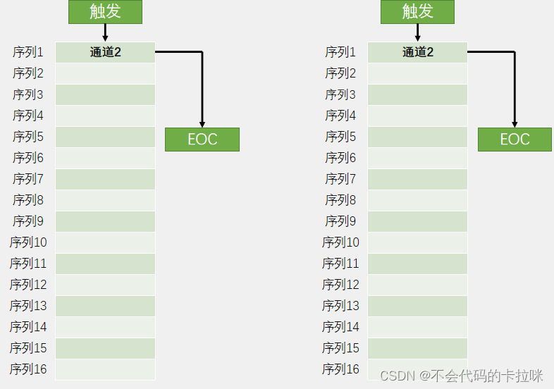 *18个输入通道,可测量16个外部和2个内部信号源(在任意多个通道上以任意顺序进行的一系列转换构成成组转换(规则通道)。例如,可以如下顺序完成转换:通道3、通道8、通道2、通道0、通道2、通道2、通道15)