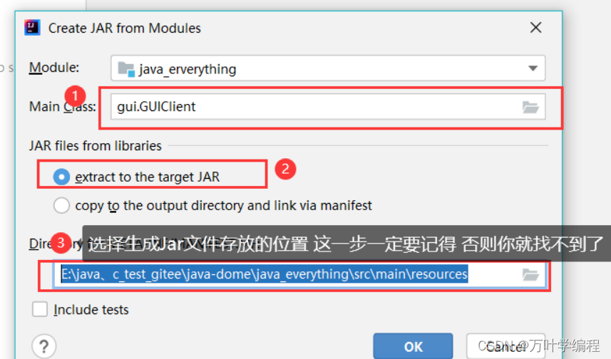 3. 选择要打包的项目,选择要执行的 main 函数和jar包路径