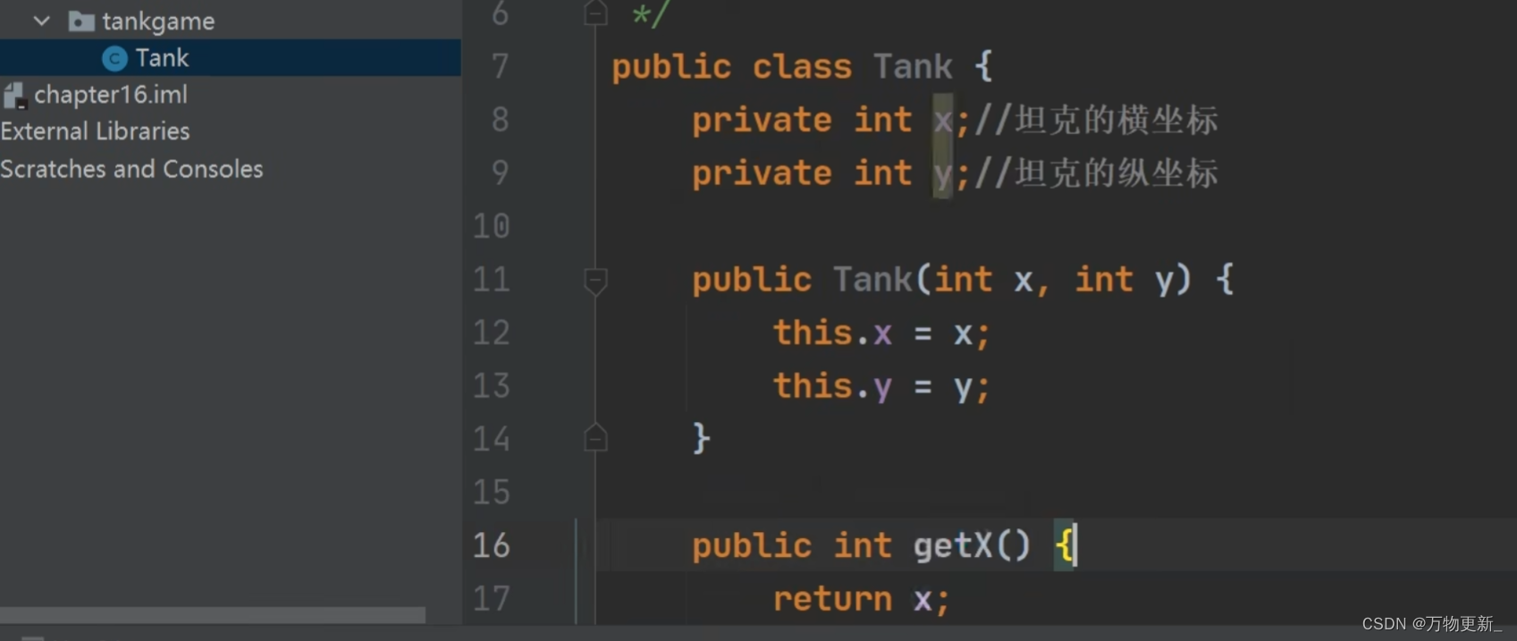 新建一个tankgame包, 新建一个类Tank, 里面包含横坐标和纵坐标