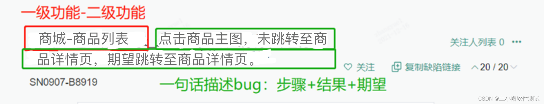 ② 内容(bug描述):操作环境 + 操作步骤 + 结果 + 问题排查及定位 + 期望