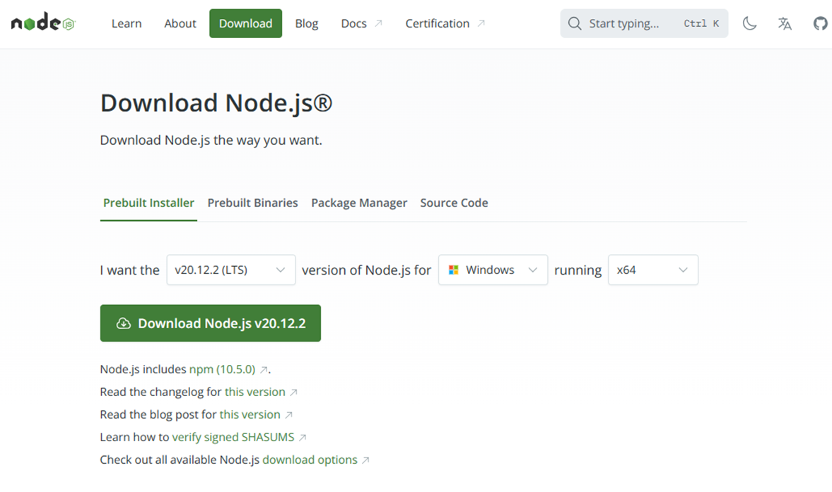 Node.js的官方网址:https://node.js.org/en/download/ ,如下图所示,当前版本是20.12.2,点击“Download Node.js v20.12.2”,下载Node.js。