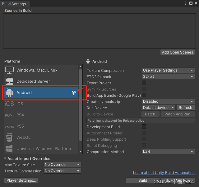 2、弹出弹窗后,点击Android选项,然后再点击Switch Platform按钮切换成安卓平台。