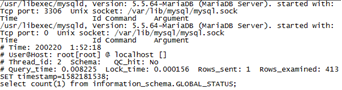 从慢查询日志中,我们也可以看到慢查询发生的详细信息,如图6-2-7所示。慢查询日志中会记录每次慢查询发生的时间、执行查询时的数据库用户、线程id、查询执行的SQL语句等信息。
