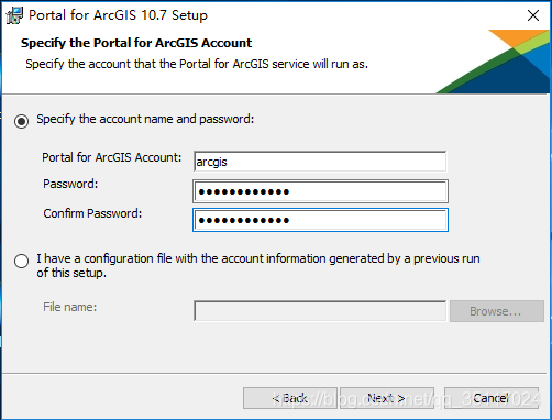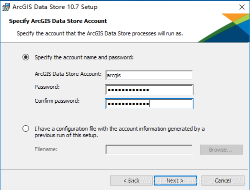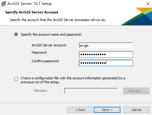 6、输入Server账户的密码(因为安装完Server后,计算机会多一个登录账户),这里我输入的密码也是arcgis,以免忘记了。然后点击Next。
